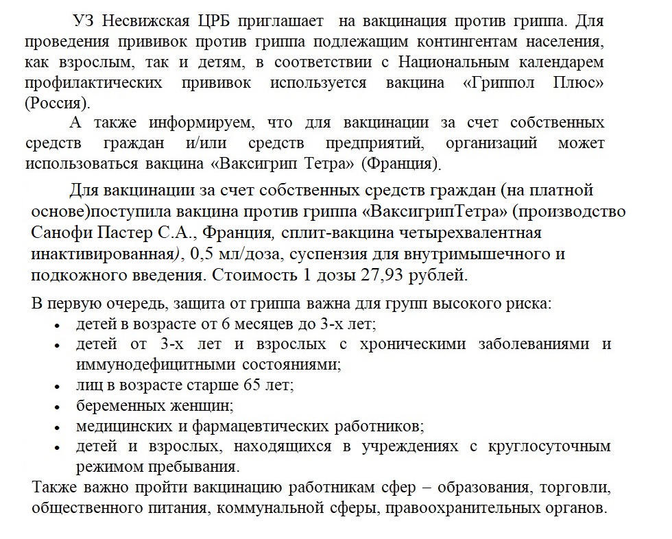 На современном этапе наиболее эффективным средством профилактики гриппа является иммунизация. В Республике Беларусь профилактические прививки против гриппа проводятся в соответствии с рекомендациями ВОЗ, согласно которым в первую очередь необходимо проводить иммунизацию против гриппа среди лиц из групп риска заражения.